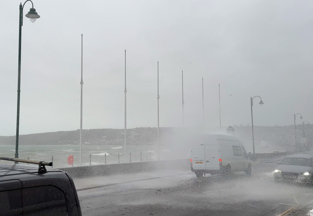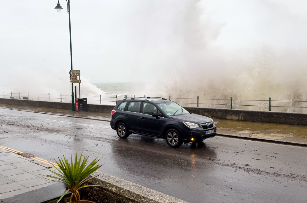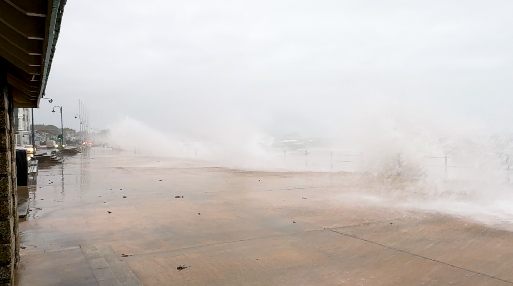 On Penzance promenade itself, the combination of powerful swell and wind driven waves pushed water right up against the wall. At times, individual sets of waves broke in just the right way to climb the full height of the structure and spill over onto the road and pavements behind. For anyone watching, each set became a sequence of booming impacts followed by an explosion of white water and spray that could be felt, not just seen.